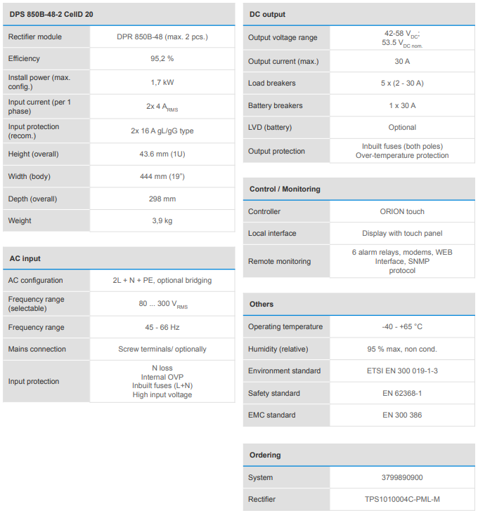 The system includes high efficiency rectifiers, AC and DC connections, battery connection and ORION controller. In addition to advanced supervision, short depth and easy installation are the success factors of the system.