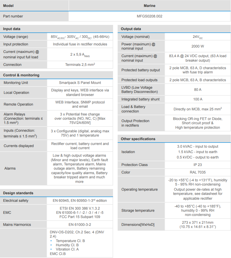 Flatpack S Wallbox 24VDC Marine The Flatpack S Wallbox is built around our Flatpack S rectifier and its compact and simple installation makes it a powerful wall-mounted DC power supply package. Its mechanical design and electrical connections are fully compatible with our previous SMPS 700 system, for retrofit of older systems. Comprehensive monitoring, LVBD, load and battery fuses are included as standard parts. AC input filters assures compliance with DnV standards for marine applications.