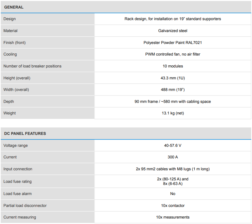 The distribution unit is built as 1U panel with front access load breakers. The panels can be installed into 19IN rack supporters. A product configurator is created for configuring up to two 80-125 A breakers and up to eight 6 - 63 A breakers.