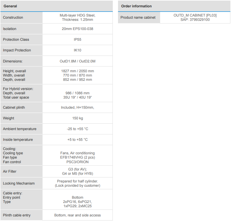 OutD “M” series outdoor cabinets are the new series of the new modular cabinets. Modular construction of the cabinet is very user friendly. Many parts like door, back wall, side walls and roof can be opened, demounted or removed on site to make the installation of the customer equipment as easiest and as most comfortable as possible. Cabinet is designed with two types of cooling system: AV (air ventilation) and AV + A/C (hybrid: air ventilation + air conditioner)