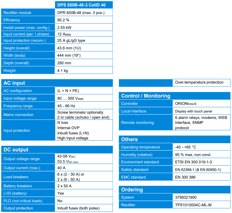 The system includes high efficiency rectifiers, AC and DC connections, battery connection and ORIONtouch controller. In addition to advanced supervision, short depth and easy installation are the success factors of the system.