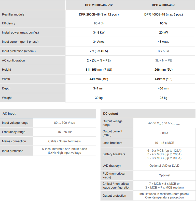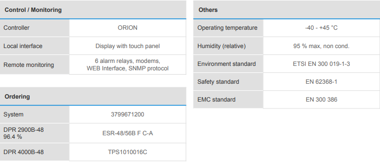 The system includes high efficiency rectifiers, AC and DC connections, battery connection and Delta ORION controller. In addition to advanced supervision, short depth and easy installation are the success factors of the system.